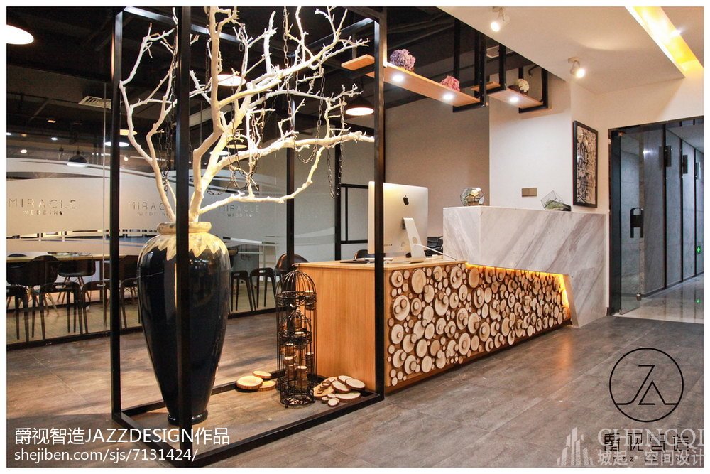 總經(jīng)理辦公室做了視線隔絕,保證了隱私性;入口處的陳列柜用于陳列公司產(chǎn)品、文化展示,但如果做成傳統(tǒng)的陳列柜勢必會導(dǎo)致空間“堵”,會使前臺走道部分光線變暗,進(jìn)門第一視野也會重心偏移,所以我采用了鐵架加木柜的半鏤空設(shè)計(jì),既能避免大門外的視野直接看到辦公區(qū),也能引入一部分的自然光線,使空間整體明亮;本案采用中置走道T字動線的規(guī)劃,最大化的縮小了走道所需占用的空間,提高走道空間利用率,并且采用了開放式