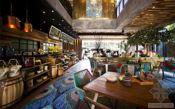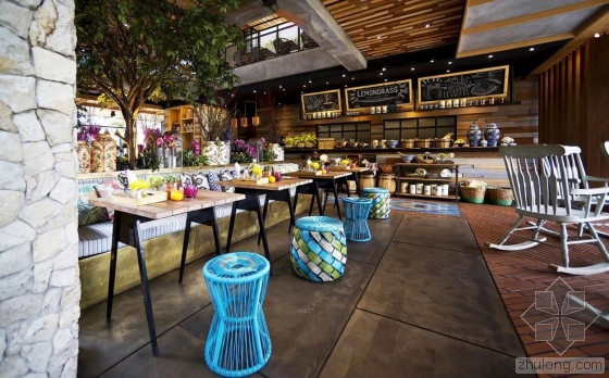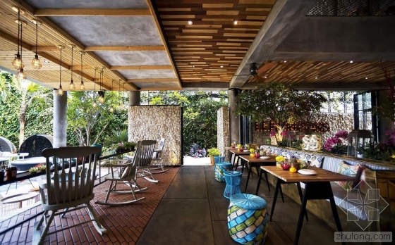 墻壁、天花板和許多家具多選擇木、石等天然的材料,地板用的水磨石磚里還混入貝殼。裝潢中大量使用的木材(除了墻、家具,甚至連盛放食物與水的容器也為木制)與花草、綠植相得益彰,又遙相呼應(yīng)了茂物的熱帶林木。室內(nèi)整體氛圍讓顧客感覺到大自然的清新,又十分溫馨舒適。