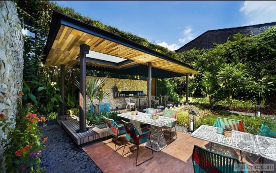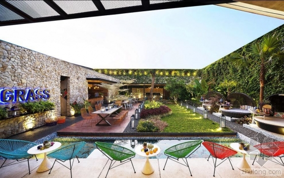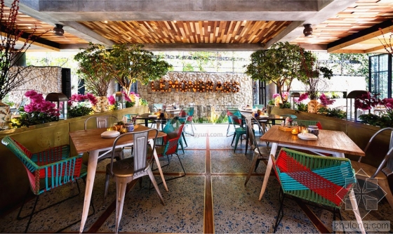 “檸檬草”就毗鄰茂物植物園而建,居于附近一個安靜的熱帶花園中。餐廳由Einstein&Associates事務(wù)所設(shè)計,整個設(shè)計理念是要將這里打造成一個“熱帶天堂”,讓顧客在這里近距離地感受茂物的美。因此,無論室內(nèi)還是室外都使用大片濃烈的顏色并種植許多熱帶植物,以讓建筑融入周邊自然環(huán)境。