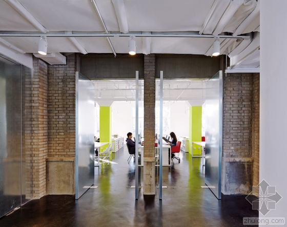 、模型制作室及小型會(huì)議室。沿著玻璃房拆除現(xiàn)有磚墻之間的窗及窗臺(tái)后,空間的滲透性得以提高。在主要工作區(qū)旁邊,幾扇連續(xù)的旋轉(zhuǎn)門(mén)外部由金屬面板包裹,構(gòu)成的墻體讓“開(kāi)門(mén)關(guān)門(mén)”變得有趣且靈活。
