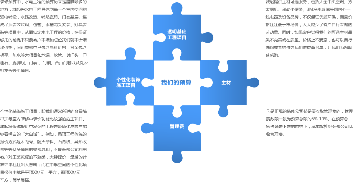 的傳統(tǒng)預(yù)算報(bào)價(jià)精細(xì)劃分為透明基礎(chǔ)工程項(xiàng)目、主材、個(gè)性化裝飾施工項(xiàng)目、管理費(fèi)四大方面, 每個(gè)方面的預(yù)算都力爭(zhēng)做到在簽訂合同前就報(bào)準(zhǔn)報(bào)全。